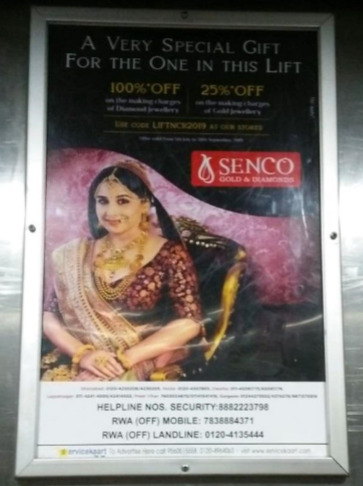 Advertisement inside residential welfare societies (RWA's) consists of all kinds of branding activities possible in the apartments like Kiosk advertising, promotional standee in New Delhi apartments, Notice board ads in New Delhi RWA's. Lift branding can be considered as a highly targeted category on RWA advertisement which will ensure visibility multiple times in a day and high chances of conversion.
