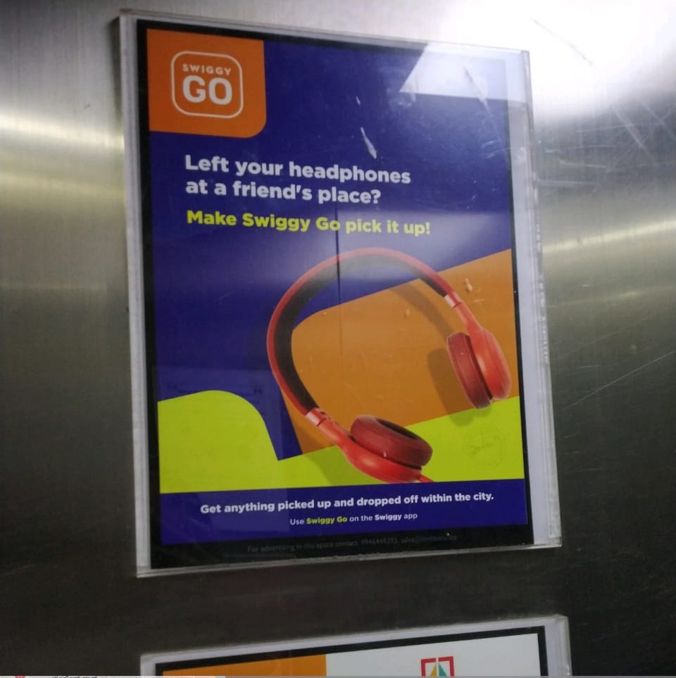 Clients from almost all categories include lift advertising in their ad campaigns across India. Recent clients for lift branding in Bengaluru were Quick Ride, Swiggy Go, Joyalukkas, Big Basket and many more.