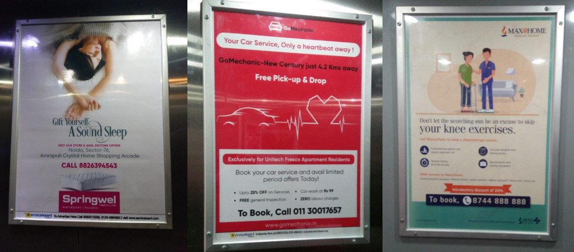 Advertisement inside residential welfare societies (RWA's) consists of all kinds of branding activities possible in the apartments like Kiosk advertising, promotional standee in New Delhi apartments, Notice board ads in New Delhi RWA's. Lift branding can be considered as a highly targeted category on RWA advertisement which will ensure visibility multiple times in a day and high chances of conversion.