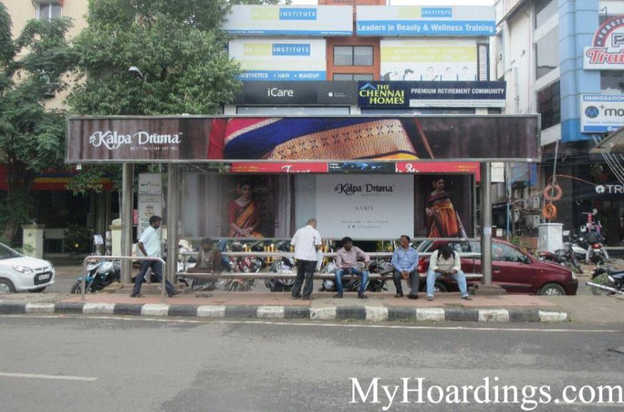 Advertising on Bus Shelter in Malar Hospital Bus Stop towards Mandaveli in Chennai, Bus Shelter