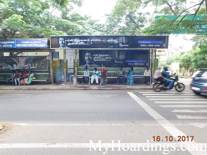 Advertising on Bus Stop in Barnaby Road, KMC bus stop in Chennai, Bus Shelter